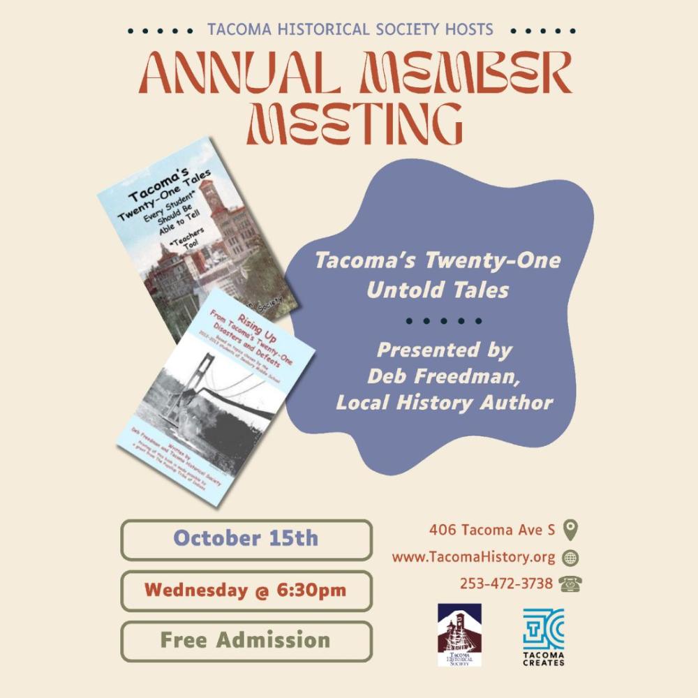 Join us for our Annual Member Meeting! There will be a brief state of the museum report followed by a presentation by returning guest speaker, Deb Freedman. Deb is a former Tacoma Historical Society board member and a local history author who has written several of Tacoma Historical Society's own publications. Deb will present on the history of THS publications and discuss Tacoma's Twenty-One Untold Tales.