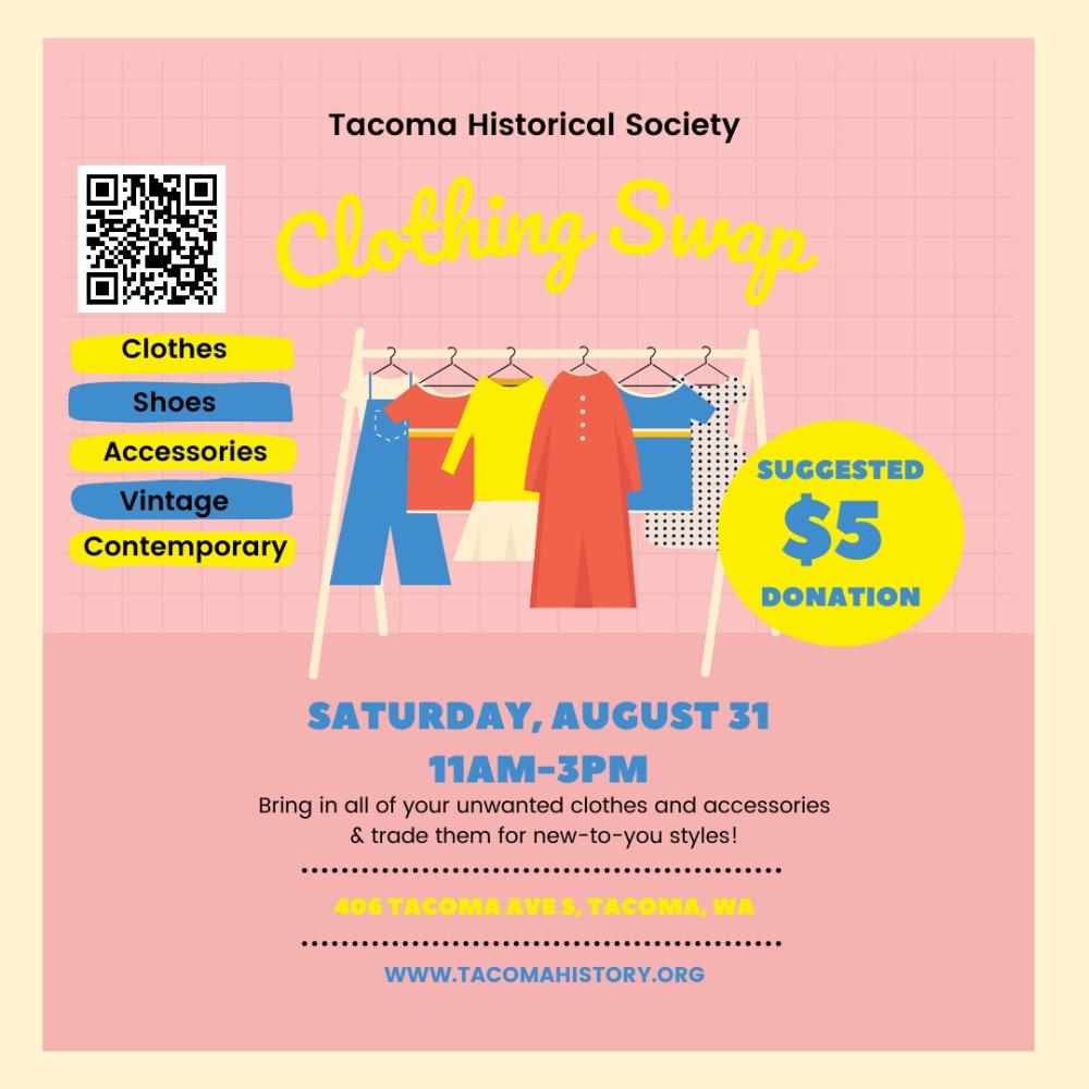 Join Tacoma Historical Society for our Clothing Swap Fundraiser! Bring your gently used, clean clothing to trade in for new-to-you styles. There will be clothing for all ages including shoes, accessories, vintage and contemporary styles! While you're here, check out our exhibit "Bustles to Blue Jeans: 120 years of Clothing Tacoma" and see how shopping for clothing has changed in Tacoma from 1880 to now!
