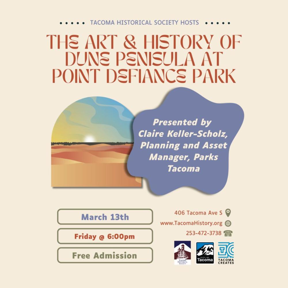 Join us for our March Monthly Program: The Art & History of Dune Peninsula at Point Defiance Park presented by Parks Tacoma Planning and Asset Manager, Claire Keller-Scholz. Claire will discuss the history of Dune Peninsula, its connection to Frank Herbert, author of the classic science fiction novel Dune, and the park's modern-day inception.