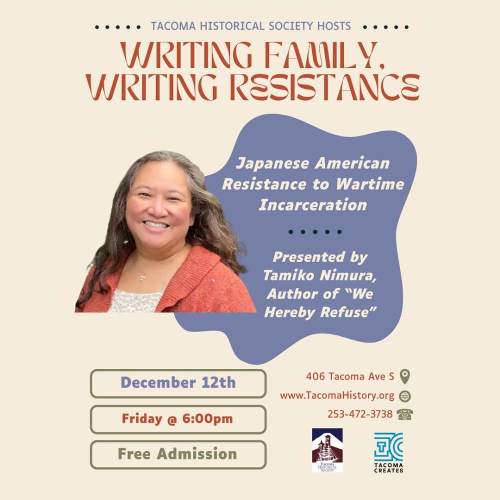 Join Tacoma Historical Society for our December speaker program featuring local author Tamiko Nimura. Tamiko will discuss her family ties to her graphic history, We Hereby Refuse: Japanese American Resistance to Wartime Incarceration, and her upcoming family memoir. This memoir includes her grandfather's fight against wartime imprisonment.